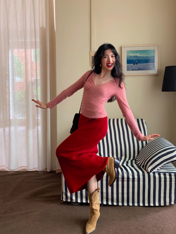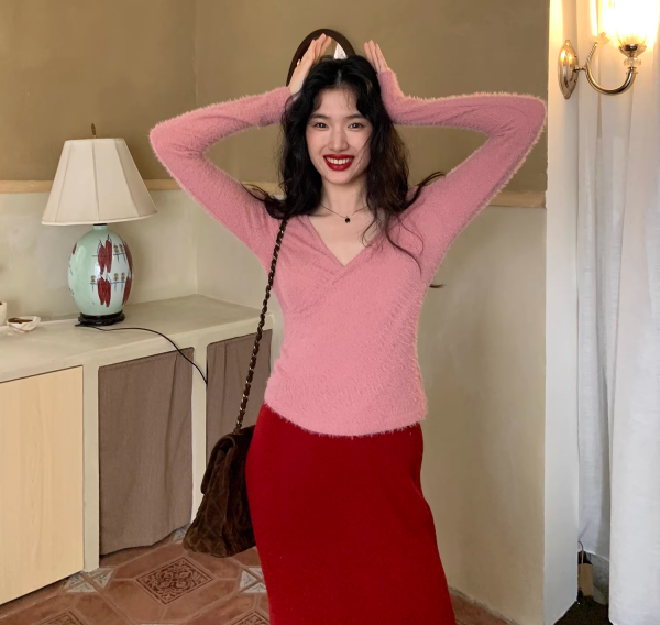 9、粉毛衣+红裙