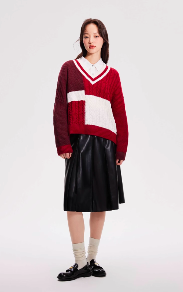 1、白衬衫+红毛衣+半裙