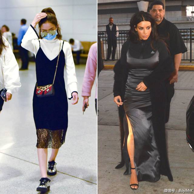 越穿越时髦的赵丽颖最近就用深蓝色吊带裙混搭白色针织衫,下摆蕾丝材质与针织面料的对比非常摩登。在时髦上一直下足狠劲的Kim Kardashian也用黑色吊带睡裙搭配同色系长袖内搭,显瘦又不出错,可借鉴性很高。▼
