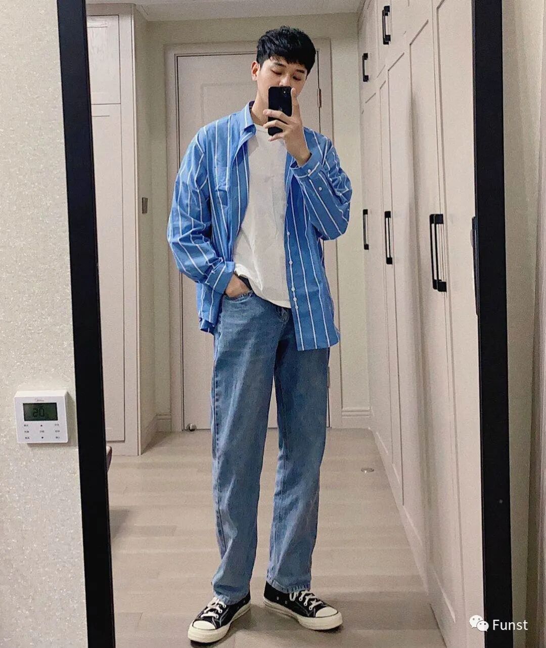如果你觉得这样有点单调的话,也可以和我一样选择,蓝色宽松条纹衬衫内搭一件白T 再搭配上宽松直筒牛仔裤,偏向于韩风,上身比较随意慵懒。
