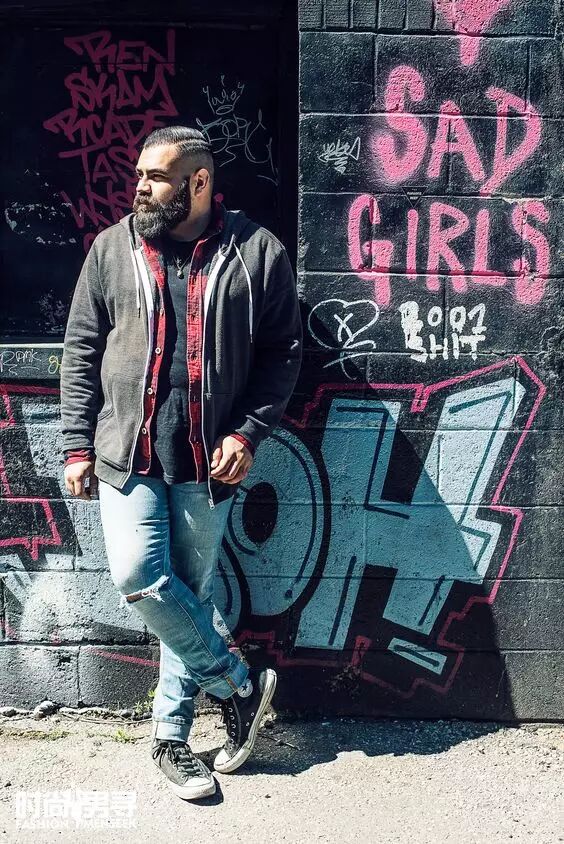 ① 忌上紧下紧。世界就是这么残酷,紧身直筒裤是给瘦子穿的,宽松T恤也是给瘦子穿的,别觉得万念俱灰,这两者之间的合身单品是微胖界男生也能驾驭的。选择合身的单品,让肩线待在肩膀边缘,让裤腿笔直不堆砌,你才是个帅气的小胖纸。▽