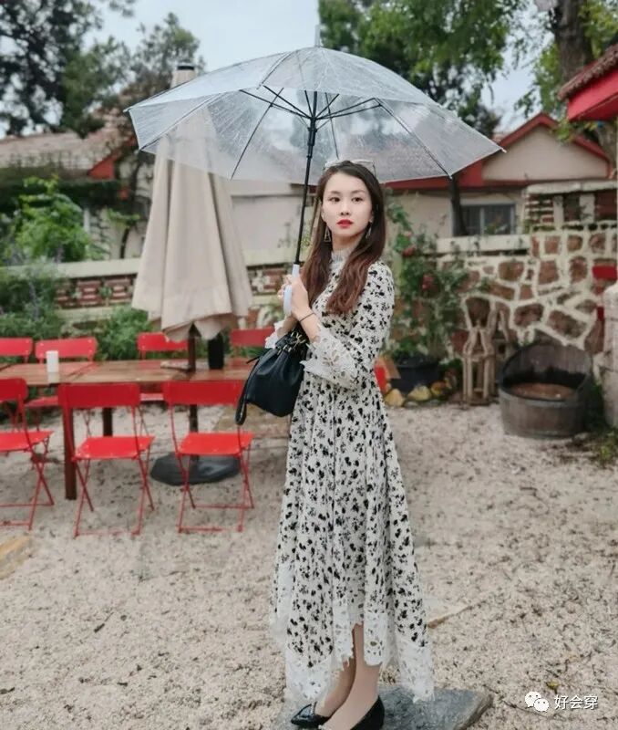 看看“是小小酱”的时尚穿搭,就是选择了一件碎花裙,素净的白色作为底色,而上面点缀的碎花则是黑色,还间或配以了蕾丝边角作为点缀在下摆,更是彰显出文艺淑女和女人味的一面,使得整体的氛围感直线上升。再配上透明的伞,更是有种文艺范儿在内。