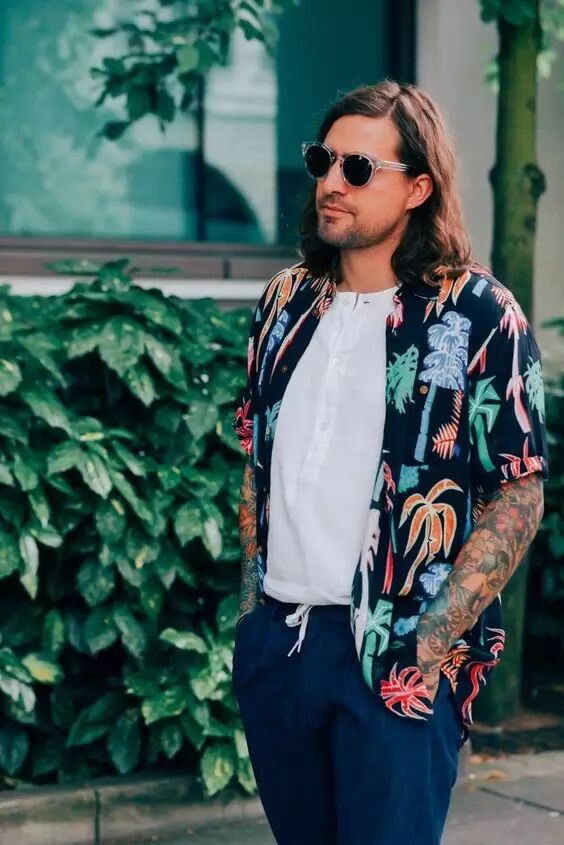 除了内长外短这种层次,你还可以利用今年很流行的印花短袖衬衫内搭纯色T恤,这样从两侧就有遮挡的物体了,然后你再把T恤扎进裤子里,看起来就有缩小肚腩的效果,同时还可以拉长腿型。