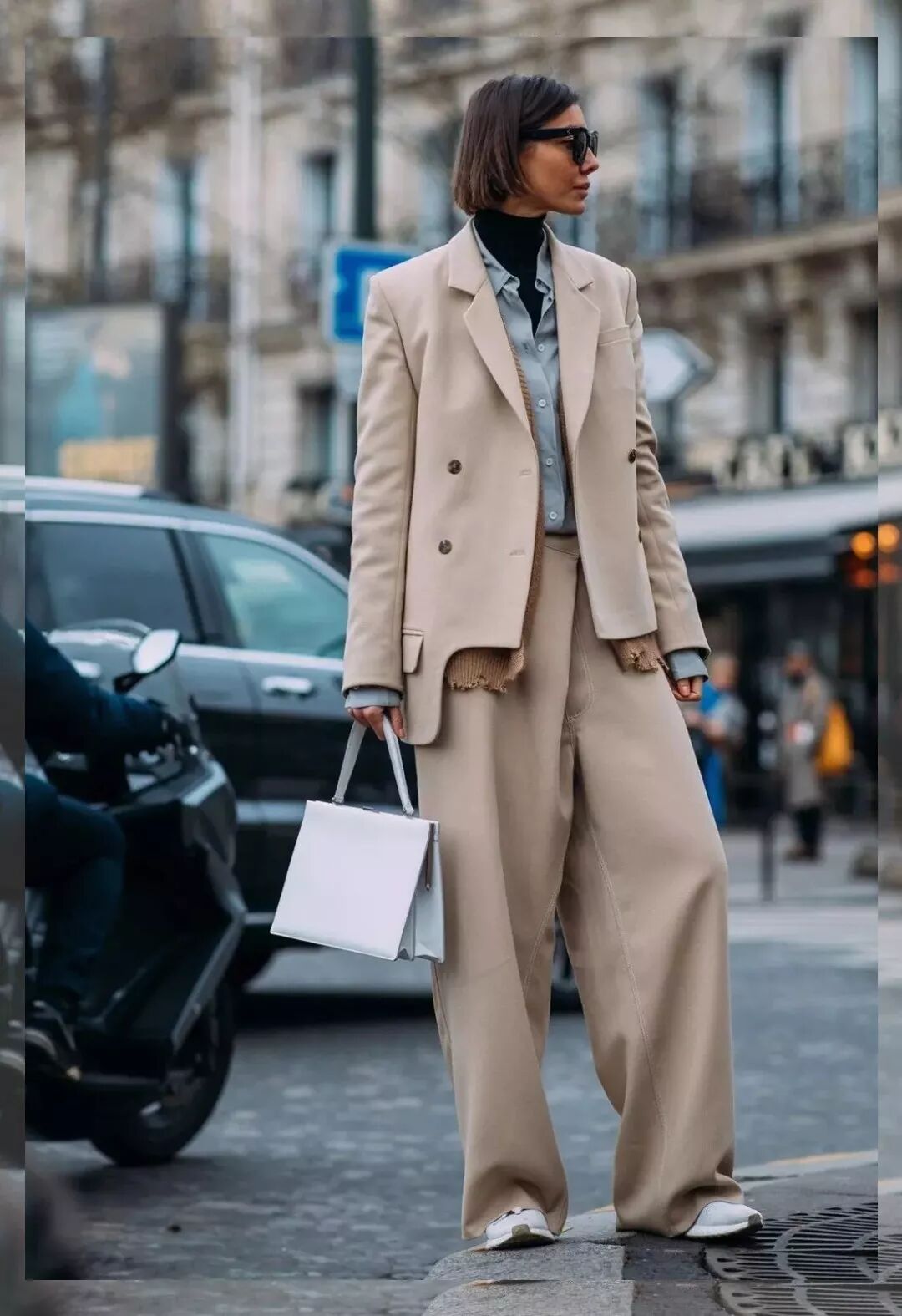 基本穿搭熟悉过后,再看不一般的穿搭,还是以Irina Lakicevic的造型为例,不苛求比例,但短夹克坐镇比例就不会输,黑皮衣+酒红高领毛衣+白裙多段分层式穿法非常随性,手拿购物袋色彩与身上单品相呼应,脚踩平底毛拖,有种“我舒适最重要、其它no care”的任性,有态度与个性就能胜出。