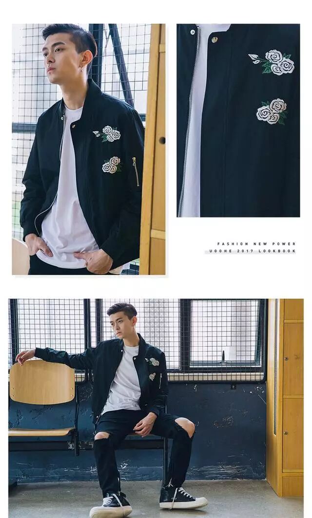 简单随意的棒球服是舂秋时尚保暖的最佳选择,黑白配色永远是经典不过时,配色棒球服内搭白色T恤干净低调,白色既好看又百搭一件单品,内外搭配最好都是同色系的才能营造一种干净帅气的美男形象。
