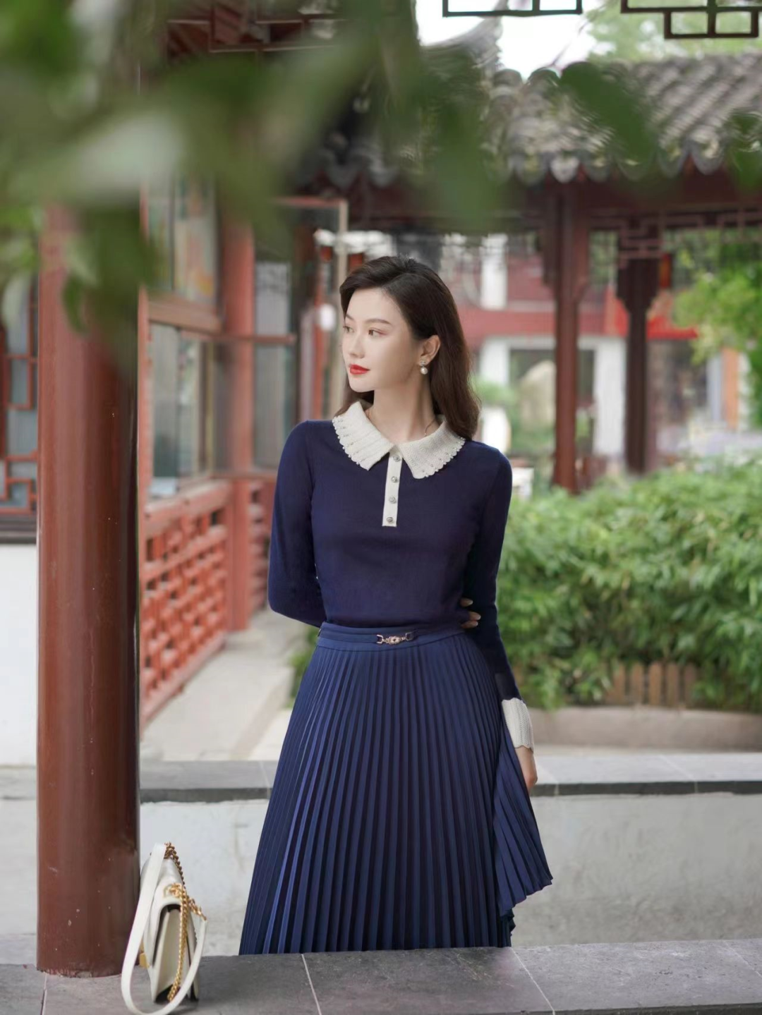 近年来流行的木耳边、娃娃领等时尚元素也是法式风格中最经典的时尚元素。娃娃领具有减龄的效果,再加上领口、袖口处的花纹设计,这些小细节会给你的整体穿搭增色不少。▼一套:珂莱蒂尔