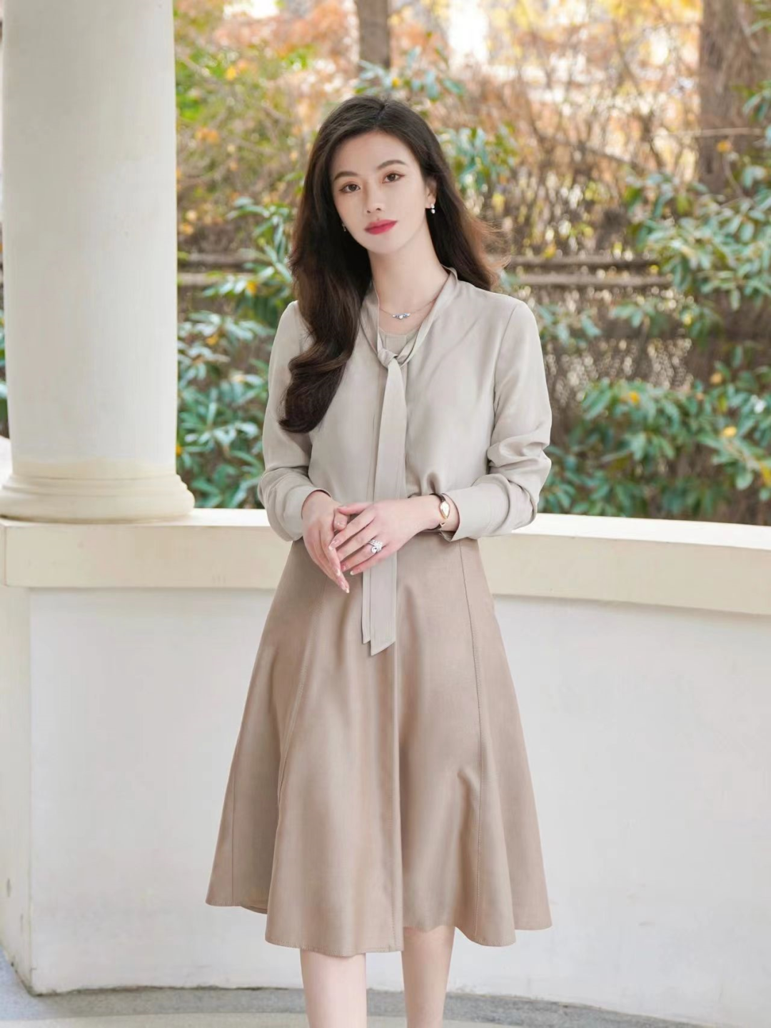 职场女性可以参考系带上衣,面料选择缎面或者雪纺的,看起来简约干练,既有女强人的干练,又增添了几分优雅。比如下面这一款纯色系带上衣,缎面的质感,搭配简约的设计,领口处的绑带设计是这件衣服的特别之处,虽然简单,但是又有隐藏的时尚小心机。▼一套:歌力思