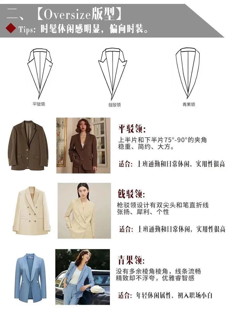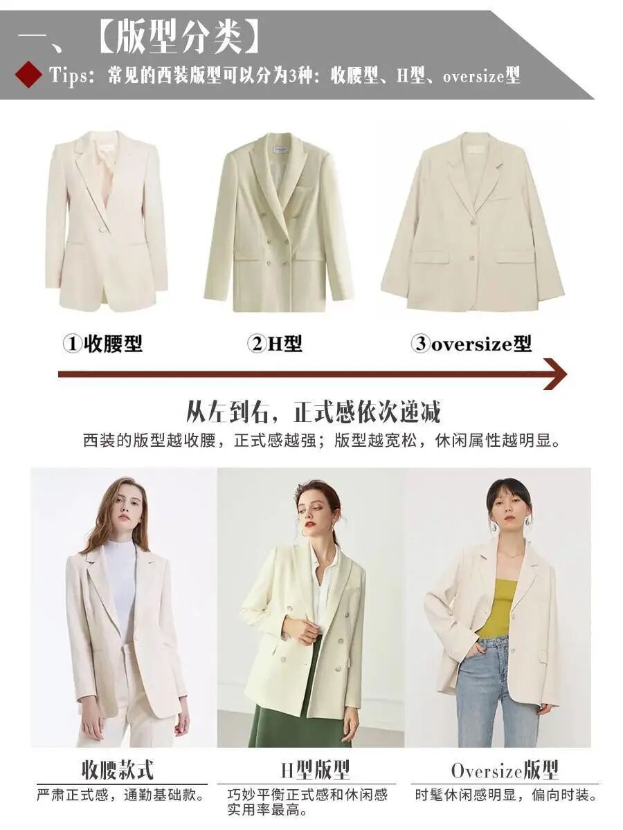 常见的西装版型一点都不局限,基本分为三种:收腰型、H型和oversize型。应对不同的场合时,这些搭配会打破你原本的规矩和枯燥,版型的差异会让你们在无形中得到优化,造型深度也会有所提高。