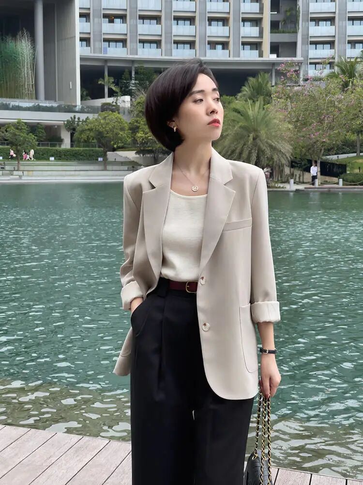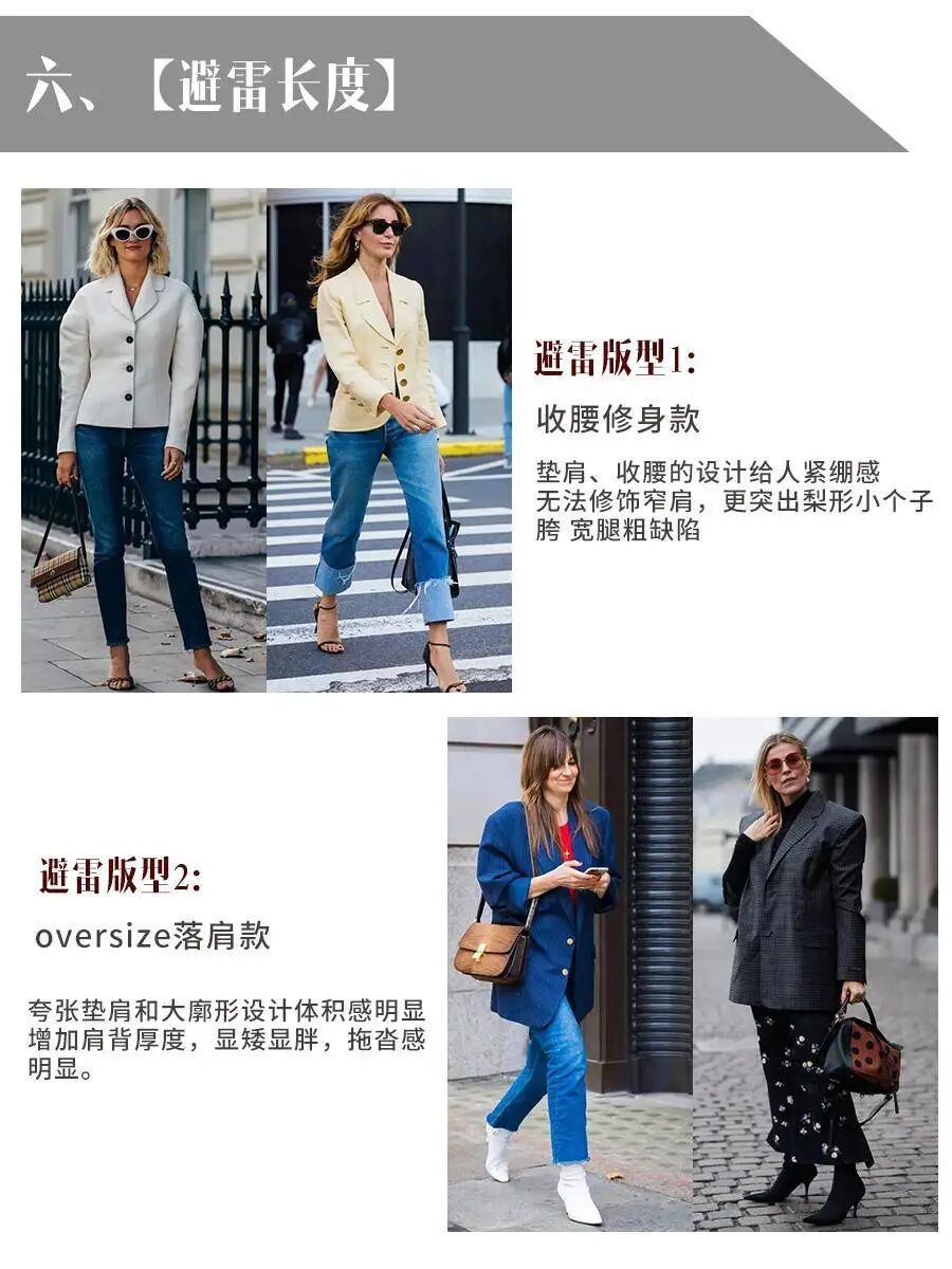 无论是T恤还是西装,长度的大小都会深深的影响一个人的体态和比例。高个子和矮个子的女生,在穿搭时所需要的长度是不一样的,推荐衣长在65-70cm的西装,这类在穿搭时美而又高调。
