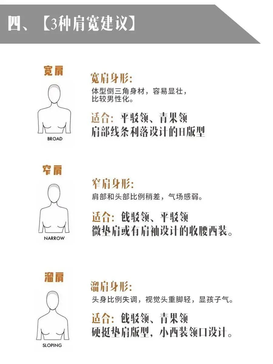 宽肩的女生在穿搭时容易显壮,倒三角式的身材选择用v领的西装来搭配的话,可以有效修饰造型,和窄肩相比较之下,这样的单品则更需要用垫肩来增加气场。而和上面两者不一样的是,溜肩在穿搭时就应该多多的减少显胖感。