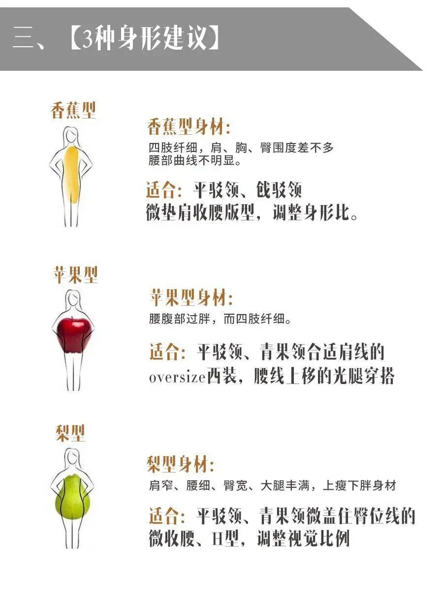香蕉型的身材曲线感不足,在穿搭时需要用一些比较收腰式的西装来加以修饰,由此身型能够被有效地优化,避免了线条上的不足;而苹果型身材的女生,在穿搭时就应该把西装腰部拉到腿部,和梨型身材相反的是线条位置的设定。