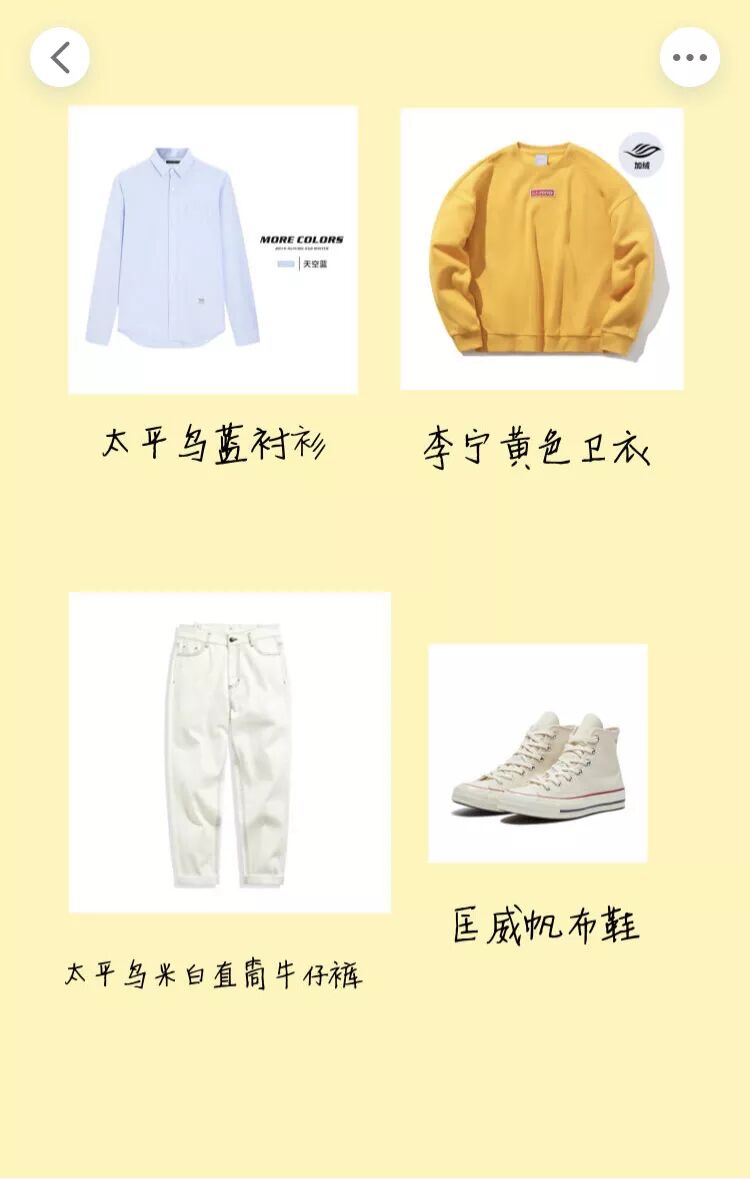 亮亮的黄色卫衣(有一点点红色Lining做装饰),露出天蓝色衬衫领子,再配上干净的米白色牛仔裤和帆布鞋,运动阳光☀️。