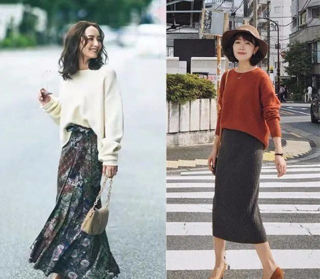 无论是稍显厚重的慵懒风白色毛衣,搭配漂亮的印花半身裙穿搭,还是流行的焦糖色针织毛衣,搭配灰黑色的针织半身裙穿搭。都是用了比较宽松的大毛衣,与高腰的半身裙穿搭,还都采用了塞衣角的穿法,简单利落不说,关键是还显高挑。