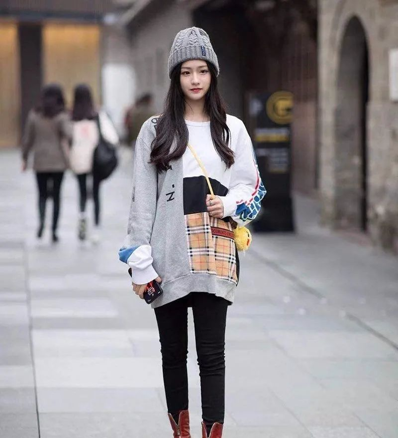 就像小姐姐这身拼色慵懒风卫衣搭配黑色小脚裤穿搭一样,上身看起来有些臃肿,但是经过下面的黑色紧身裤搭配之后,似乎更多人会把目光聚集到下面修长的腿型上面去,如此轻松显高的穿搭方式,你学会了吗?