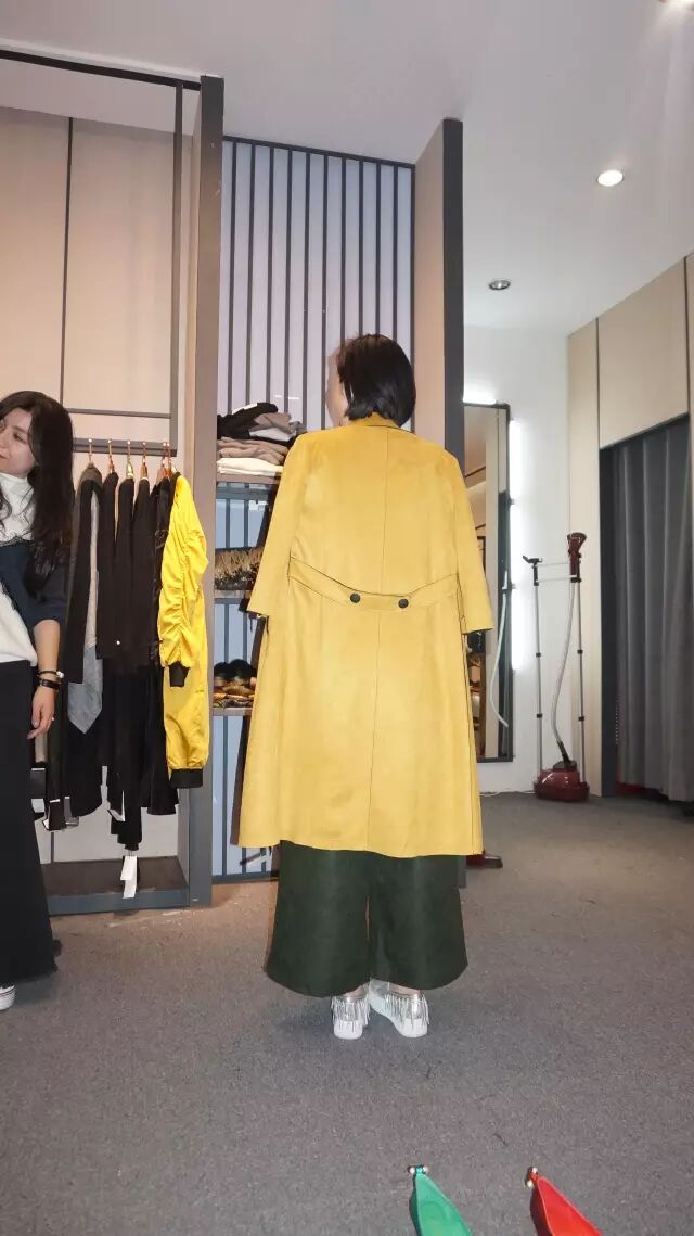 但需要注意的是,这样混搭有一个小技巧,就是芥末黄风衣的材质需与下装裤子材质相吻合,像这套风衣是硬质的反皮,阔腿裤也是较硬的尼质,混搭才不会突兀哦~