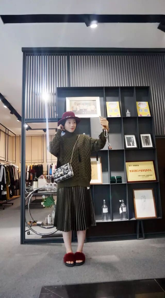 ▼推荐搭配:墨绿色粗棒高领针织毛衣+绿色丝缎百褶裙(这套搭配深受闺蜜们喜欢!)