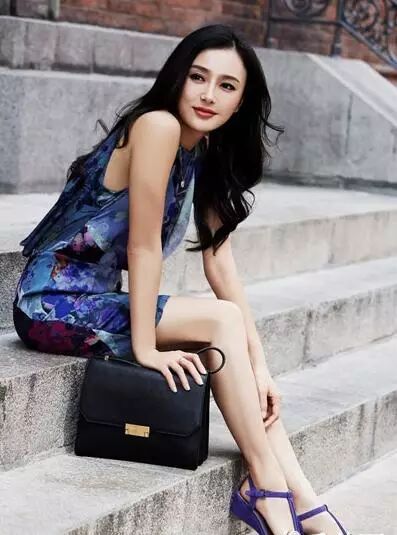 秦岚穿着印花连衣裙,配上紫色平底凉鞋,衬托白皙肤色,展现出优雅迷人的气质,黑色包包与卷发造型,真是一位富有内涵的职场淑女户外约会的造型。