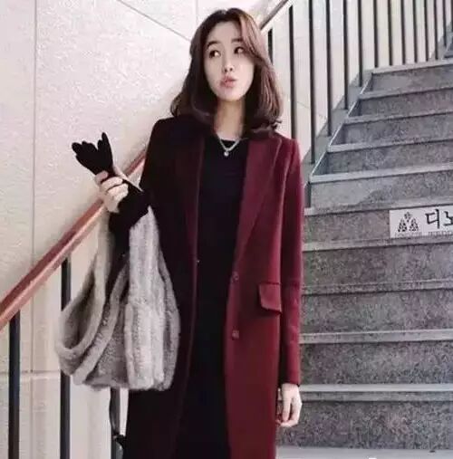 酒红色的呢子大衣在颜色上就已经胜出了,酒红色就超级衬肤色的一款颜色,加上这款大衣的版型是西装的版型,可休闲也可正式,不会让人感觉随意,大大的西装翻领,两侧的大口袋,以及长度到膝盖,都是特别恰到好处的设计。