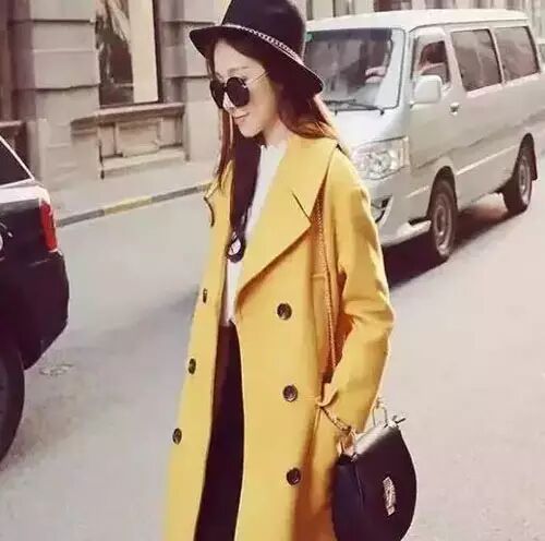 大翻领的设计让你的脸型显得更加的小,双排扣的时尚感和两侧的大口袋。大V的设计显瘦哦。宽松的版型也是十分遮肉,颜色在这秋冬天里也是十分亮眼的黄色。