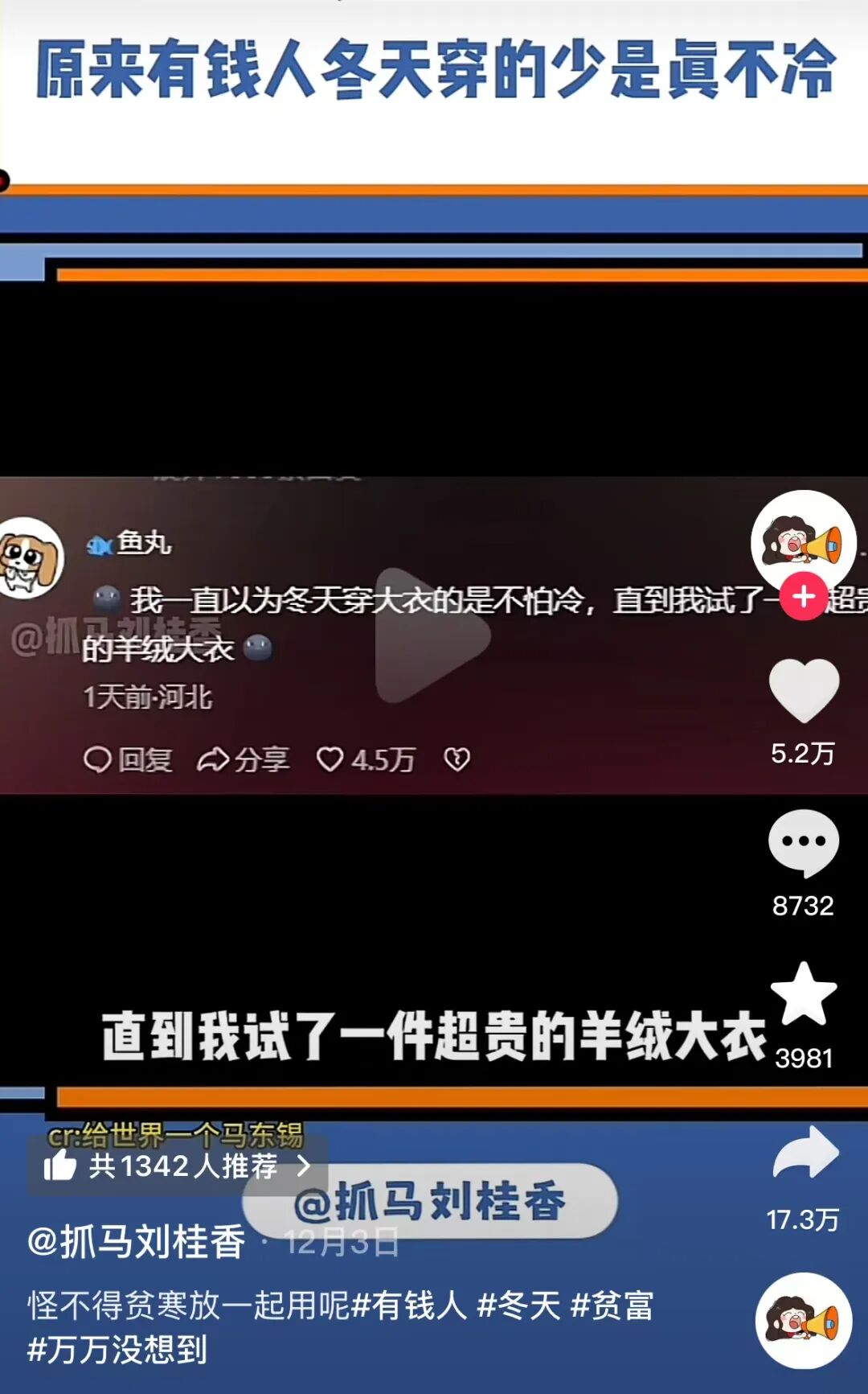 在网上刷到一个段子说,冬天是最能体现贫富差距的季节。一直以为冬天穿大衣的人是不怕冷,直到穿了羊绒之后才知道原来有钱人冬天穿这么少是真的不冷啊。
