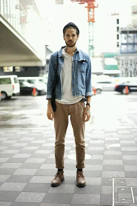 最常见的思路是搭卡其裤,蓝色和棕色撞色搭配,随性又日常,非常有邻家大男孩的味道。