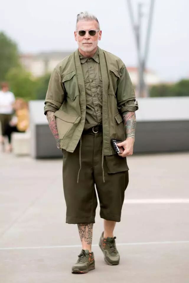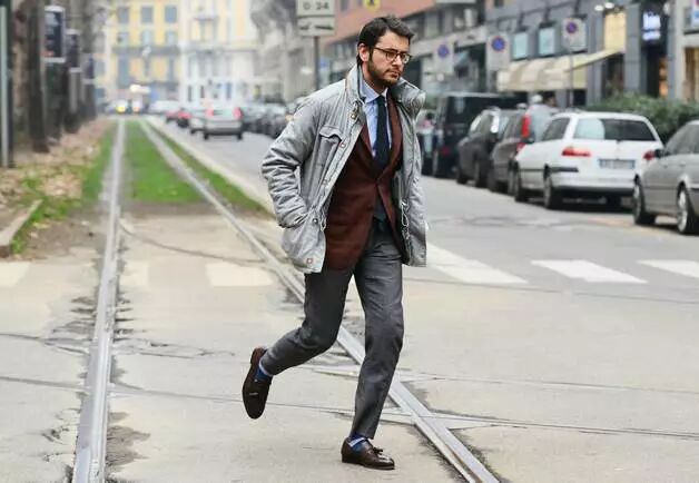 原本精致的西服外套,配上工装夹克,立刻显得野性十足。