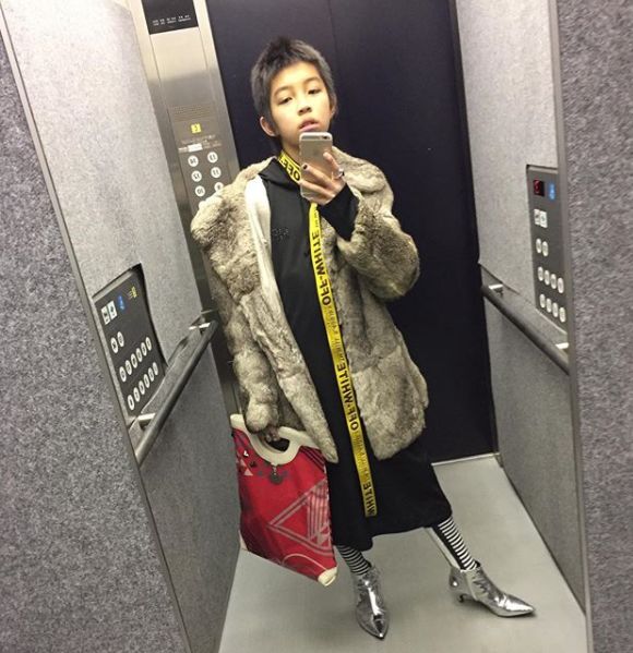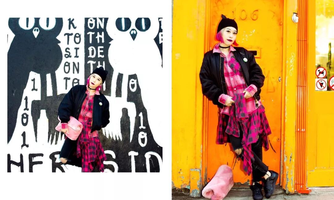 但除了vintage,Yoshi还喜欢融合朋克风,尤其喜爱金属配饰vintage混搭,就连拍照,衣服和和表情都是搭配的,除了丧丧的超模表情,嘟嘟嘴伸伸舌头搞搞怪也很是吸粉。