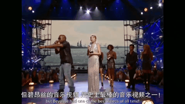 Kanye突然打断正在发表获奖感言的她,并说“碧昂斯的MV才是最好的”。