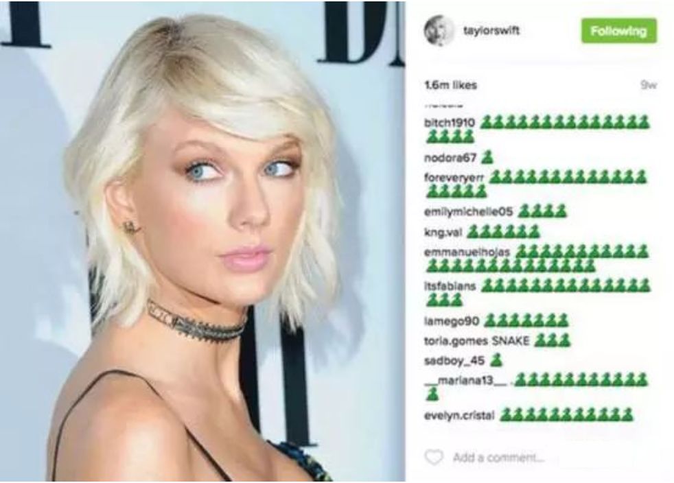 网友选择相信Kanye,在网络上开始疯狂辱骂Taylor,说她是蛇蝎女人,在她的ins账号底下,刷满了🐍