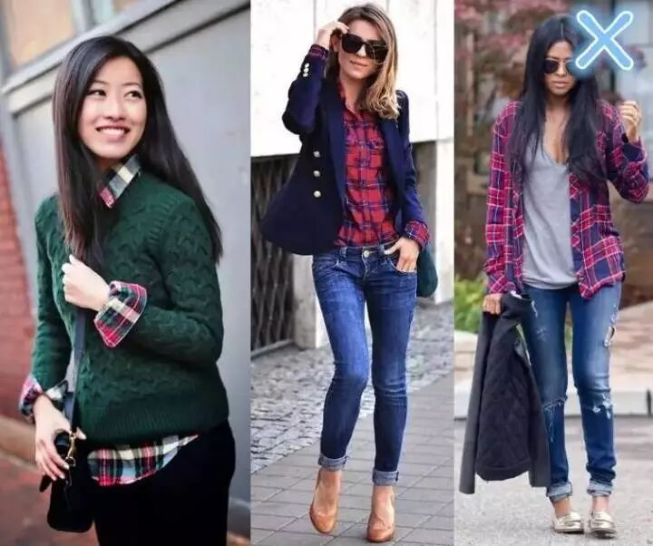 出错的一般是下面这些。格子太小,看起来凌乱土气,尤其是就这样直接穿,下摆也没有扎到牛仔裤里面。