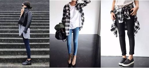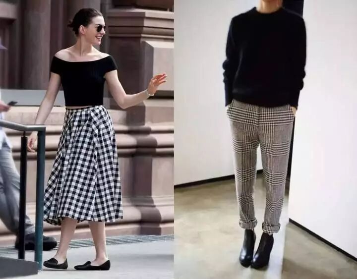 还有这类格子如果做成裙子或裤子,穿起来就比较挑人了。一个不小心,就会暴露腿短的毛病。即使身材很好,也很容易看起来不协调。或者下面就要穿高跟鞋起到拉着线条的作用。