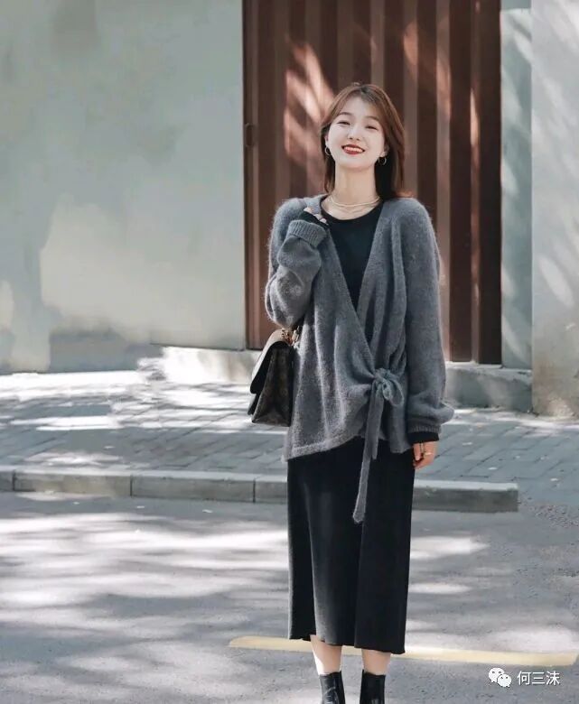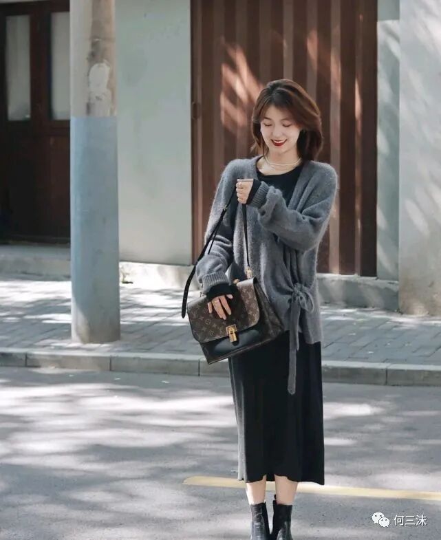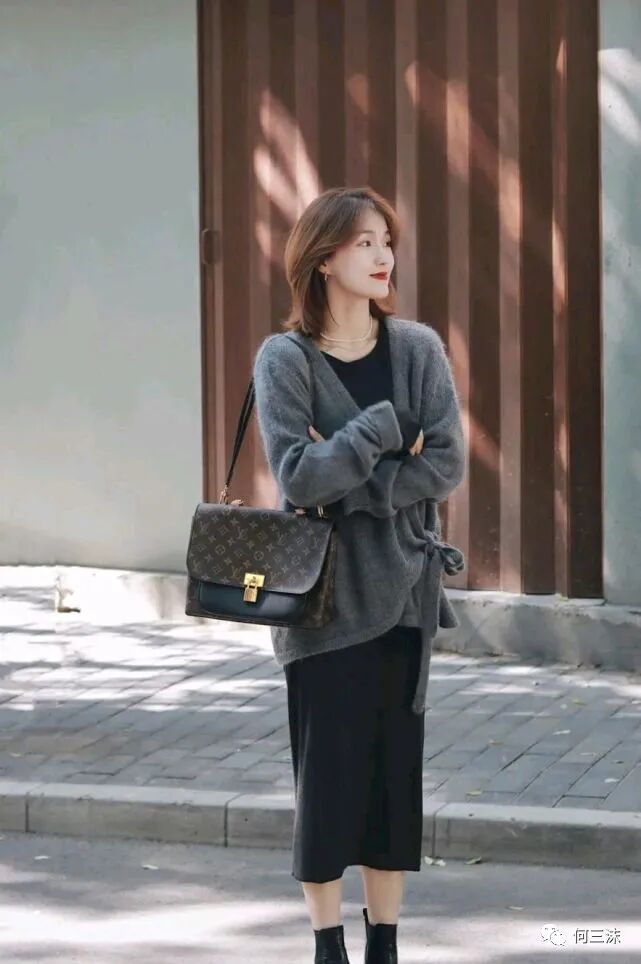 想要呈现出优雅的气质,所选择的服装款式可以很简约,但一定要选对,并且在会搭配的情况下,不仅能彰显出温柔气质,还能穿出精致的美感,可以借鉴一下这位时尚博主的穿搭风格,这位时尚博主选择了灰色针织开衫搭配黑色连衣裙,虽然都是以冷色为主,但是却给人一种低调中透露着高级的感觉。