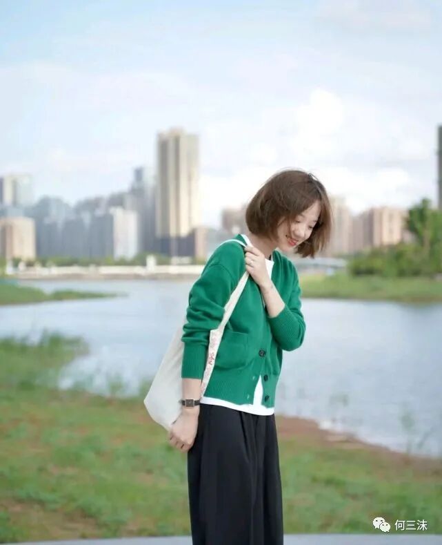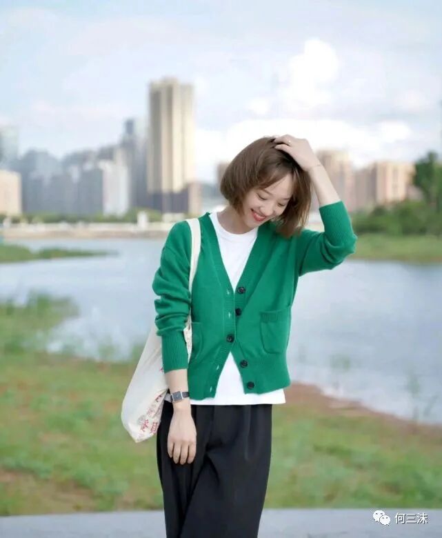 这位时尚博主选择了一件绿色针织开衫搭配黑色宽松裤,穿出来的视觉效果既简单又温柔,并且大部分女生都可以轻松挑战,这身穿搭之所以穿出了高级感,首先一点服装的配色选对了,这位时尚博主为了让整体穿搭造型更有活力,所以她选择了绿色针织开衫来穿。