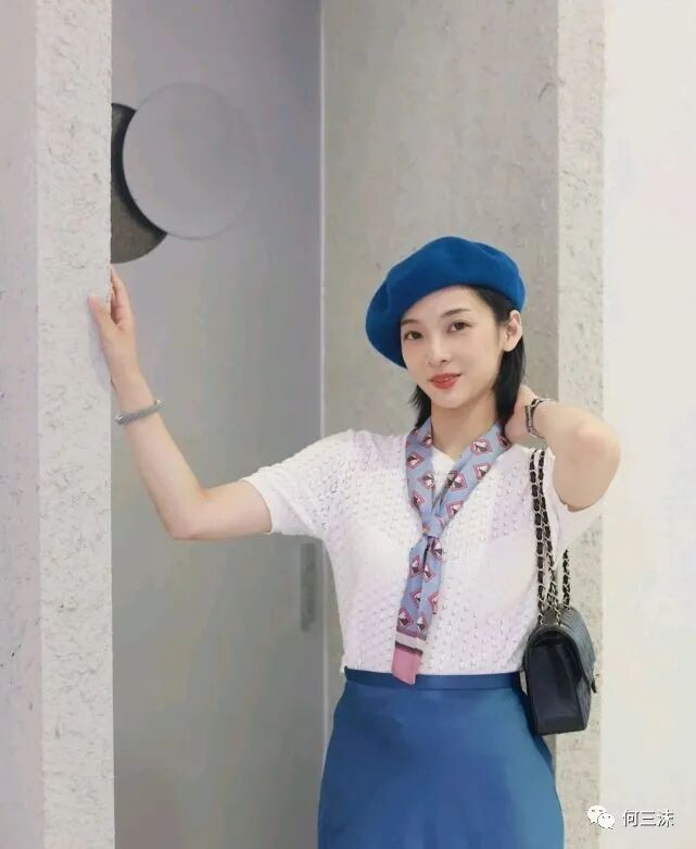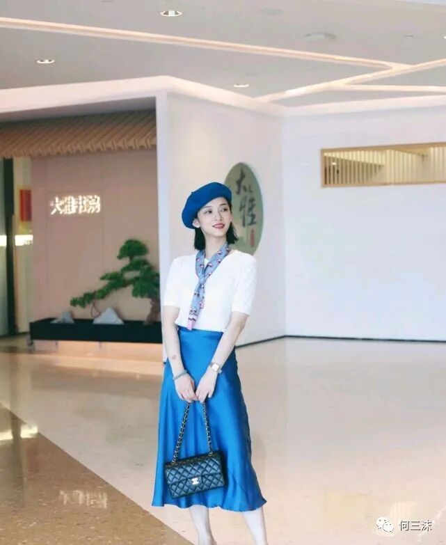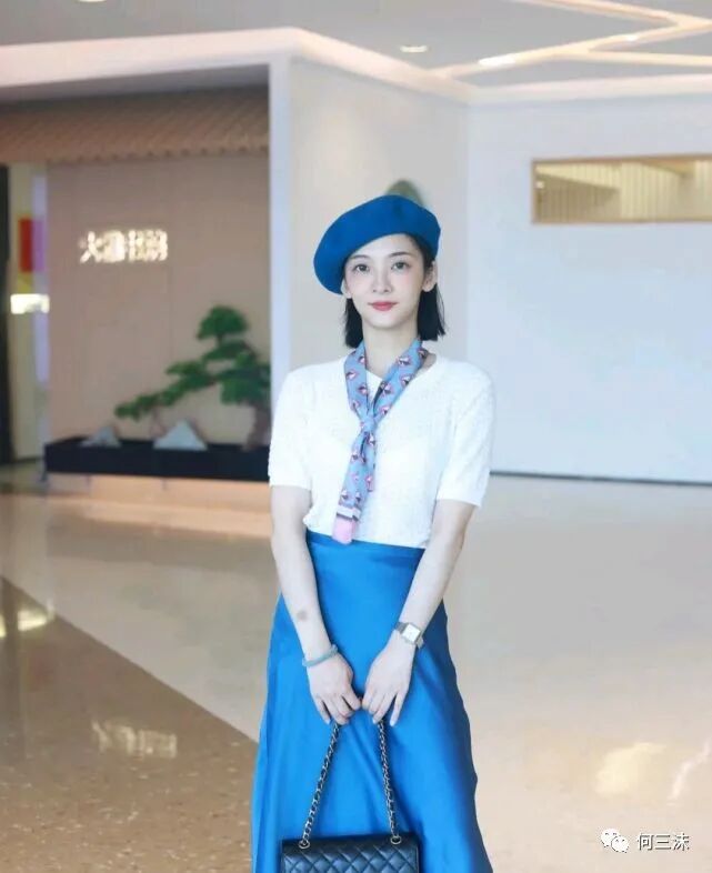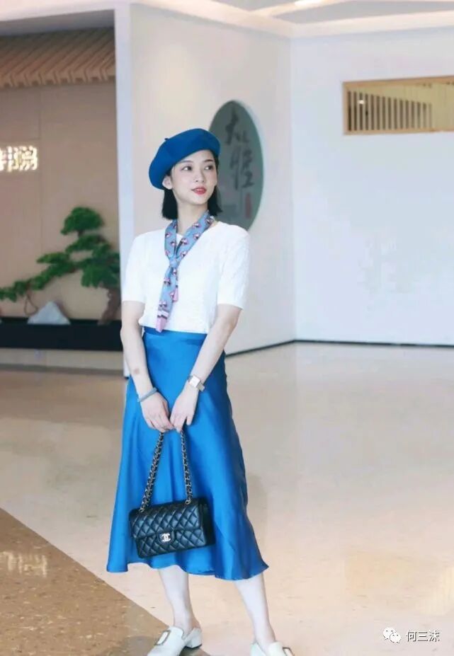 其次,这位时尚博主选择了同色系穿搭,贝雷帽、半身裙包括丝巾都是以蓝色为主调,在这身穿搭里起到了相互呼应的作用,在配色上就不会觉得有突兀感,而且还避免了单调感,轻松穿出高级感。
