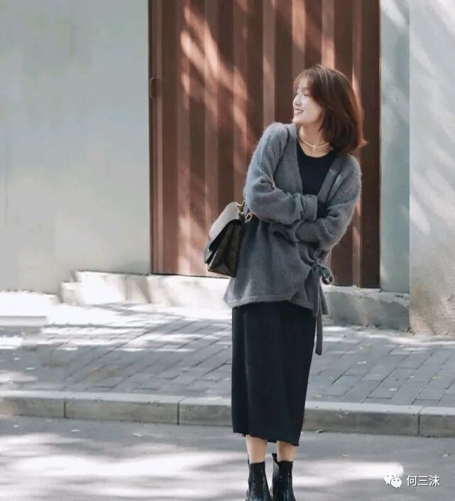 灰色针织开衫搭配黑色半身裙,虽然很低调却能穿出温柔的气质,并且还很显瘦,重点是低调的服装颜色大部分女生都可以轻松挑战,年纪偏大的女性朋友也可以优先选择这类似的服装穿搭。