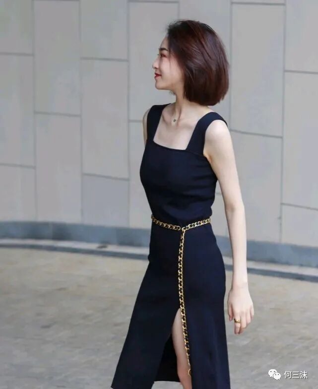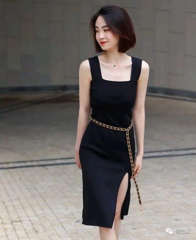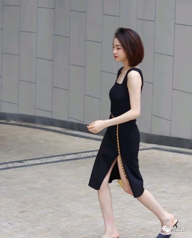 可以借鉴一下这位时尚博主的穿搭风格,她选择了黑色吊带的衣裙来穿,虽然是很简约的设计,但不得不说比较显瘦。
