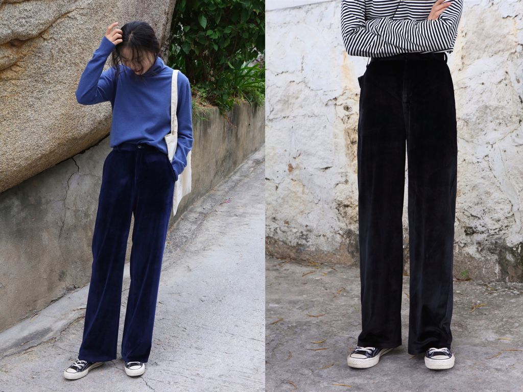 像下面这种丝绒材质的面料很容易反光,加上腿围偏小,会没有那么适合腿粗人,阿甲亲测显胖。
