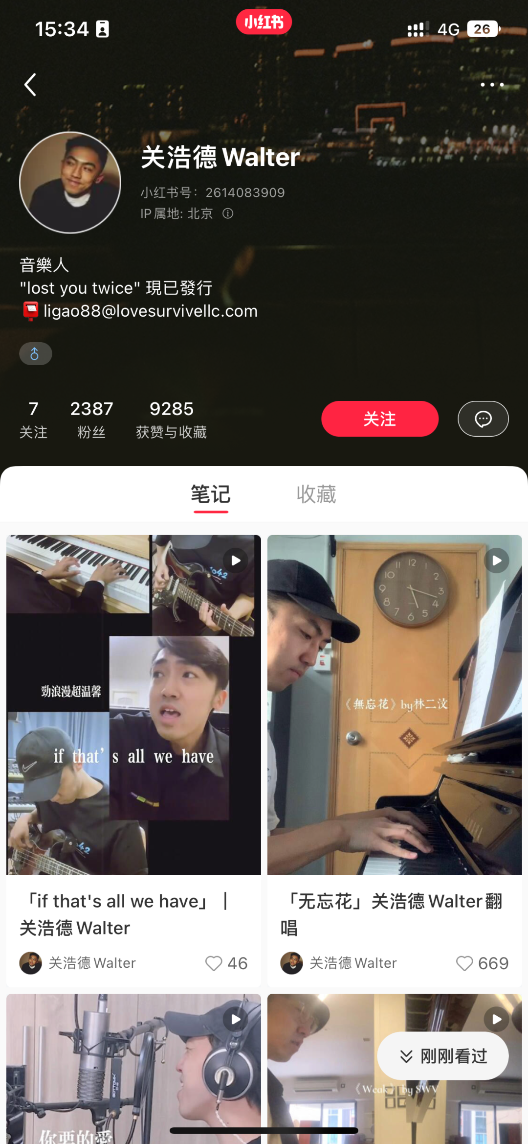 关浩德Walter在小红书分享翻唱日常