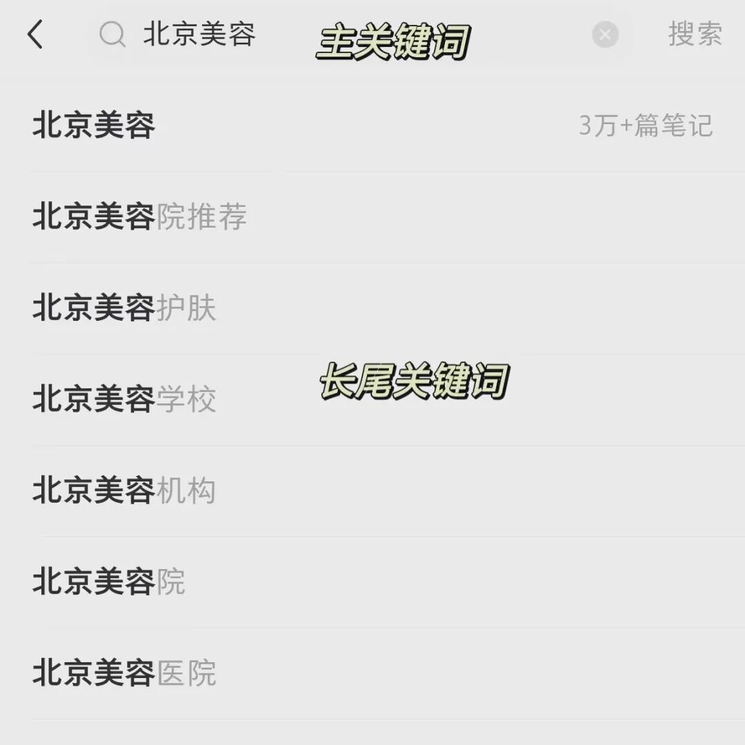 如何做好站内搜索,就是关键词布局。关键词布局,决定你的笔记会不会出现在用户的搜索结果里。试想一下自己玩小红书的习惯:想买某类产品-打开小红书-输入关键词-浏览相关笔记。关键词如何布局?一个是主关键词,一个是长尾关键词。比如我搜索“北京美容”,这个是主关键词,下拉框出现的全部是长尾关键词。
