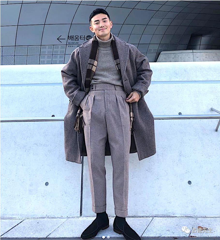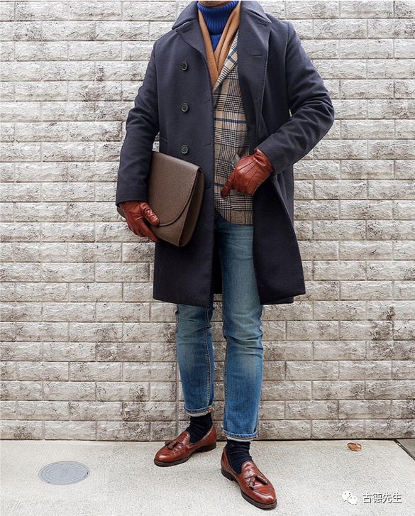 如果先生们想让西装领大衣变得生动而休闲,不妨试试内搭一件高领毛衫,这样的穿搭,实用,保暖↓