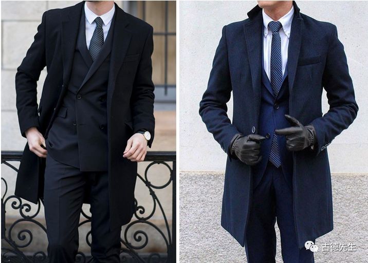 穿搭建议1:大衣+西服,虽然是最经典的商务造型,但也要注意颜色对比;