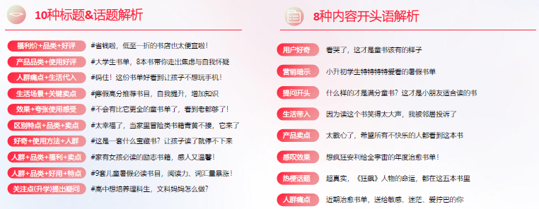 标题,要言之有物,看之有用,听之受益。我们总结了10种标题&话题解析以及8种内容开头语的解析,见下图。