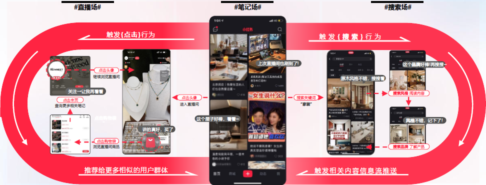 “笔记”和直播两者不是割裂的,联动起来才能更好地达成经营效果。也就是说想要获得更多直播流量,必须经过这样一条路径:创作优质“笔记”—吸引粉丝—关注账号—直播间带货,驱动“品—效—销”全链路营销场景,赋能品牌,拉动收益增长。