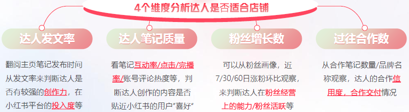 那么,怎么判断一位达人是否适合我们呢?我认为有4个维度:第一,达人的发文率。可以翻阅他的主页,查看“笔记”发布时间,从发文率来判断达人是否具有较强的创作力,以及他在小红书账号上的投入度。第二,达人“笔记”质量。可以重点观察“笔记”的互动率、点击率、完播率、评论热度等,判断达人创作的内容是否贴近小红书用户的喜好。第三,粉丝增长数。可以观察近7日、30日、60日的涨粉环比情况,判断达人在粉丝经营上的能力和粉丝活跃度等。第四,过往合作情况。可以观察达人的合作“笔记”数量、品牌名称,判断他的合作信用度、合作交付情况。