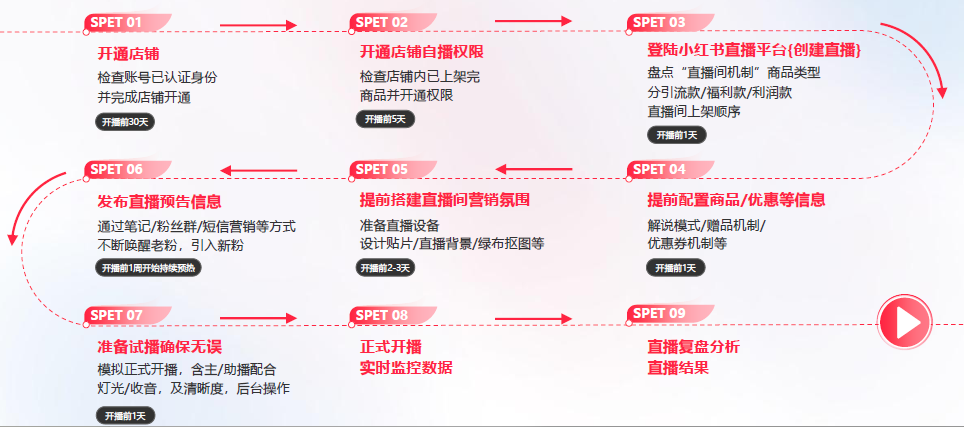 关于小红书商家自播,以开播前30天为时间节点,我们做了一张流程图,并标注了在每个步骤里需要注意的问题: