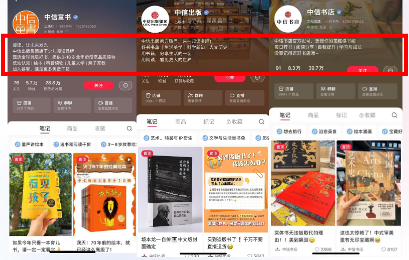 举个例子,中信出版集团的小红书账号——“中信童书”“中信出版”“中信书店”。这三个账号在头像上都带有“中信”二字,每个账号的内容定位也能从名字中看出来,一目了然。下图框出来的账号简介一栏,需要商家用简短而有力量的文字把自己的优势展示出来。