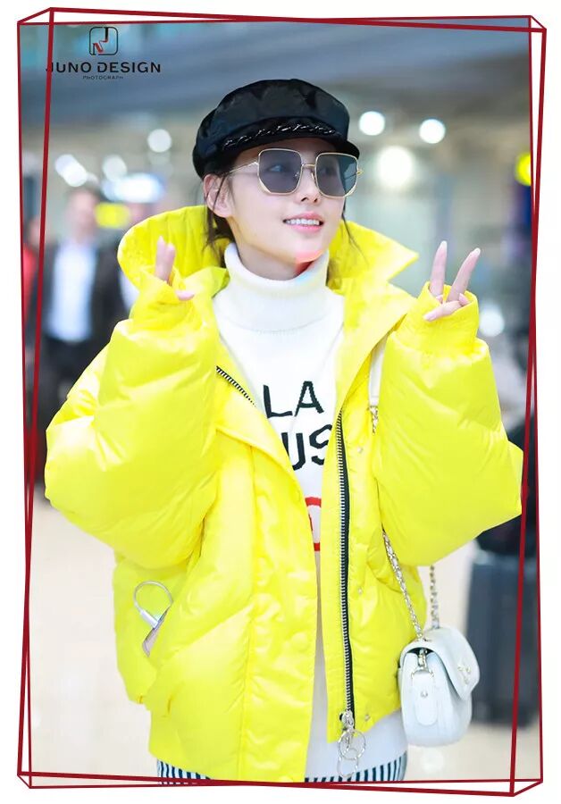 张嘉倪穿着黄色羽绒服