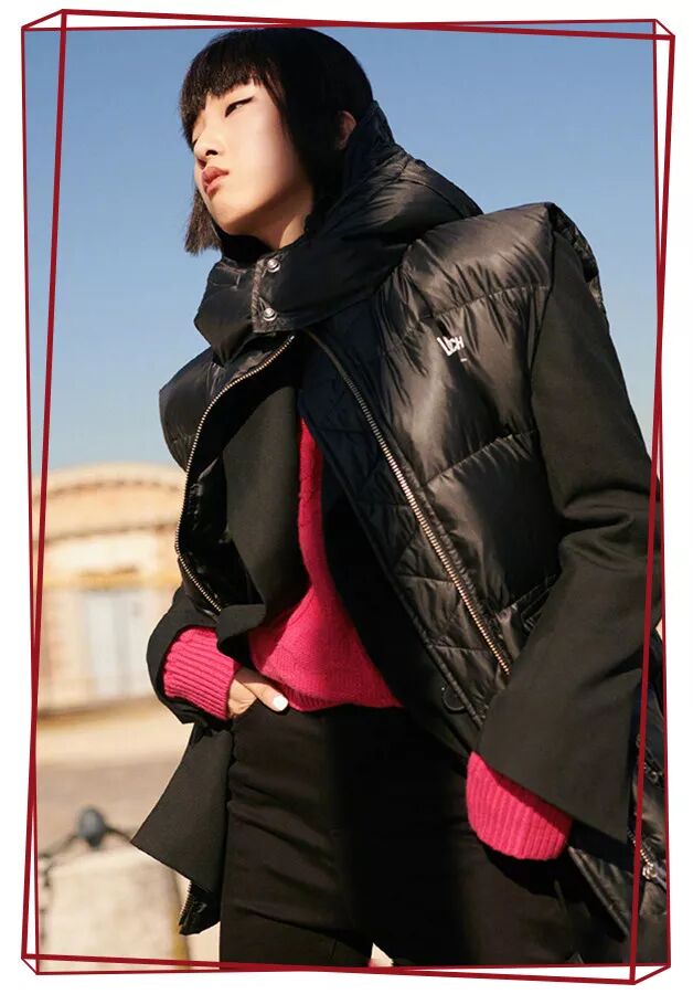 Yamy在黑色羽绒服里加了玫红色的毛衣