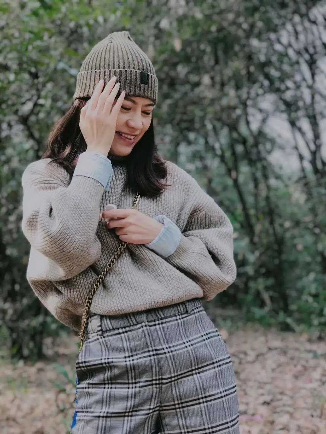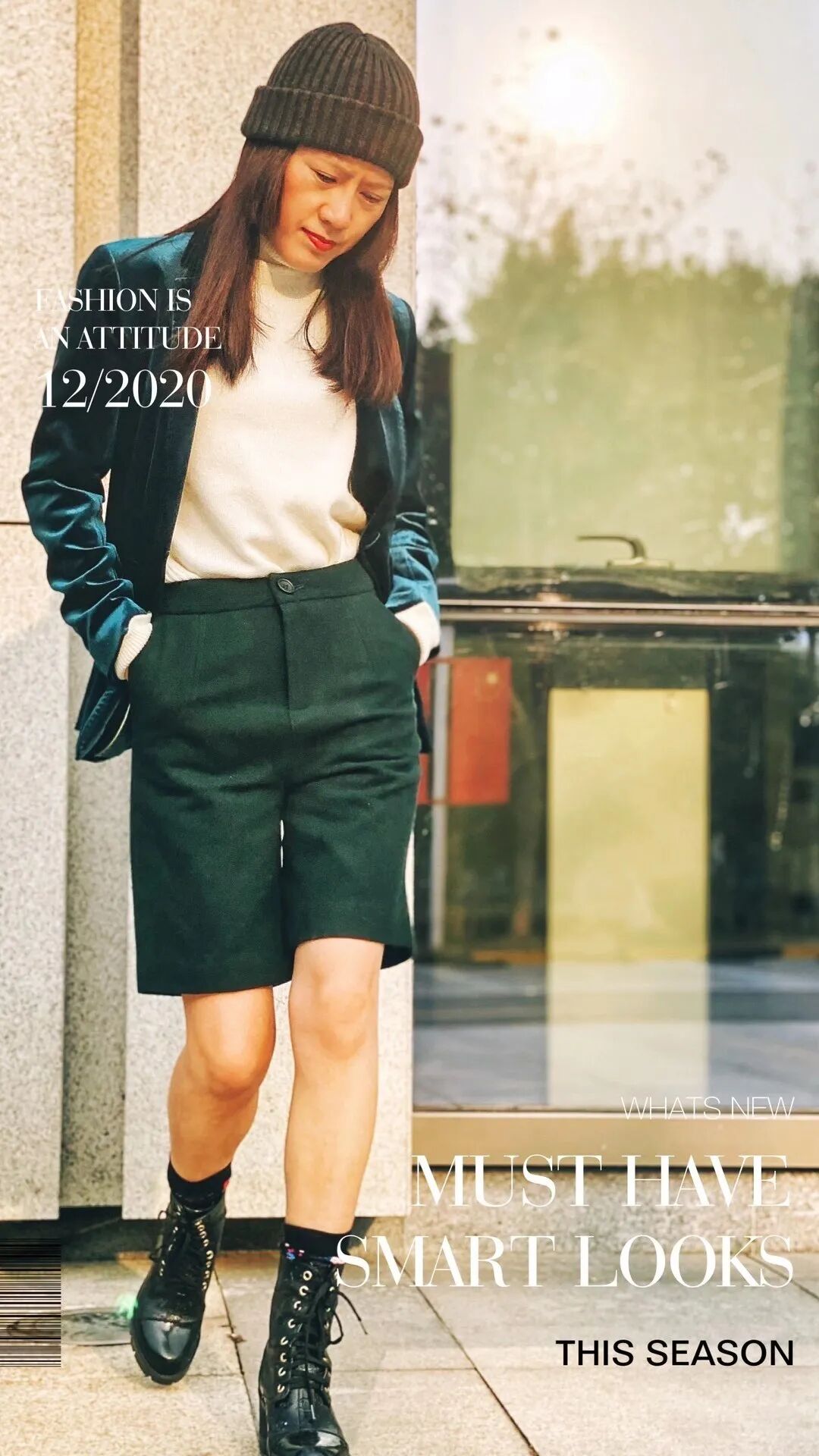 深灰大衣和浅灰色的短靴自成一体,中和了红色调的张扬,呈现出时髦而有内涵的质感。军绿色坎肩上衣+祖母绿百褶裙