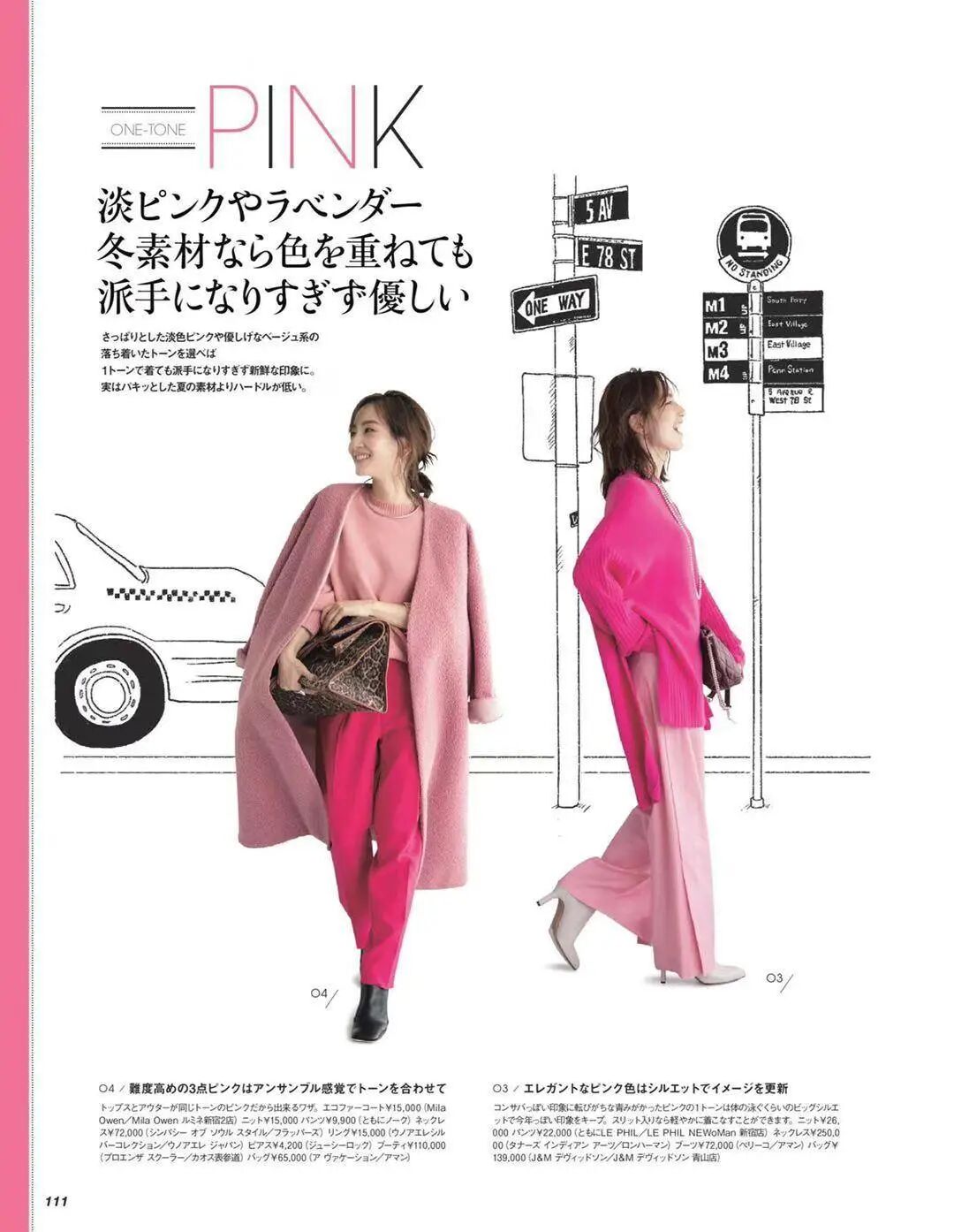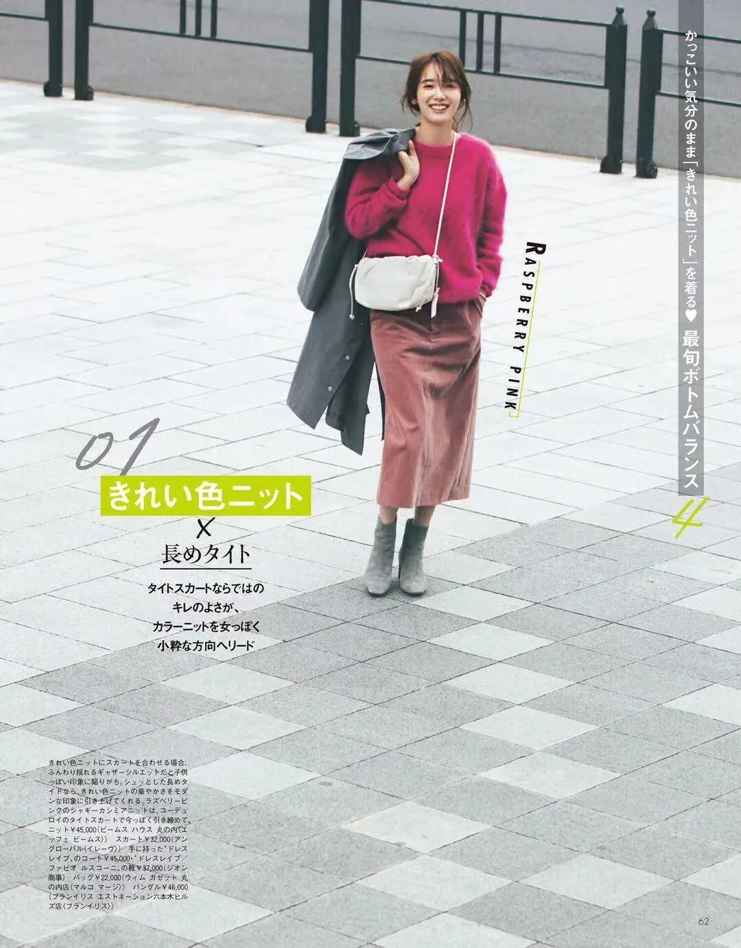 高饱和度的玫红色毛衣,给人一种魅惑又炽烈的感觉。藕粉色半身裙的加入显得温柔,又多了一些亲和力。